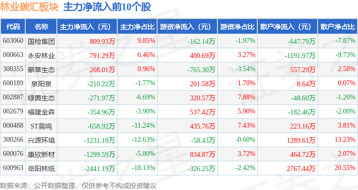 从资金流向上来看,当日林业碳汇板块主力资金净流出8112.58万元,游资资金净流入2360.41万元,散户资金净流入5752.17万元。林业碳汇板块个股资金流向见下表:
