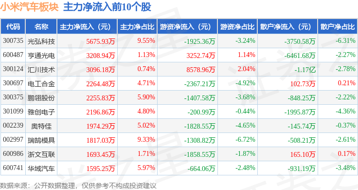 从资金流向上来看,当日小米汽车板块主力资金净流出26.82亿元,游资资金净流入3.26亿元,散户资金净流入23.56亿元。小米汽车板块个股资金流向见下表: