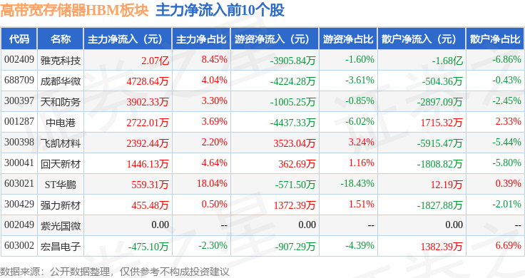 从资金流向上来看,当日高带宽存储器HBM板块主力资金净流出15.3亿元,游资资金净流入4.54亿元,散户资金净流入10.76亿元。高带宽存储器HBM板块个股资金流向见下表: