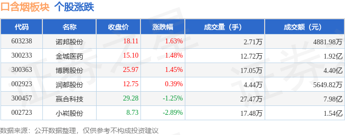 证券之星消息,1月12日口含烟板块较上一交易日上涨0.03%,诺邦股份领涨。当日上证指数报收于4165.29,上涨1.09%。深证成指报收于14366.91,上涨1.75%。口含烟板块个股涨跌见下表: