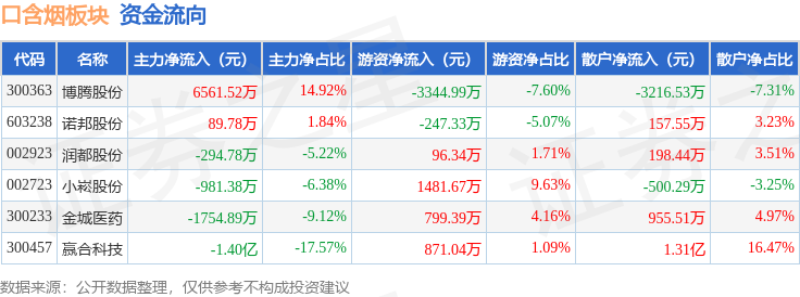 从资金流向上来看,当日口含烟板块主力资金净流出1.04亿元,游资资金净流出343.87万元,散户资金净流入1.07亿元。口含烟板块个股资金流向见下表: