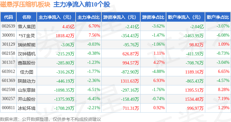 从资金流向上来看,当日磁悬浮压缩机板块主力资金净流入2.77亿元,游资资金净流出2.41亿元,散户资金净流出3642.63万元。磁悬浮压缩机板块个股资金流向见下表: