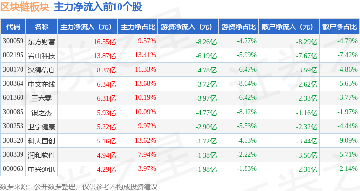 从资金流向上来看,当日区块链板块主力资金净流入98.14亿元,游资资金净流出61.34亿元,散户资金净流出36.8亿元。区块链板块个股资金流向见下表: