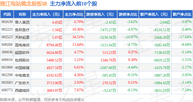 从资金流向上来看,当日雅江电站概念股板块主力资金净流出14.33亿元,游资资金净流出52.28万元,散户资金净流入14.34亿元。雅江电站概念股板块个股资金流向见下表: