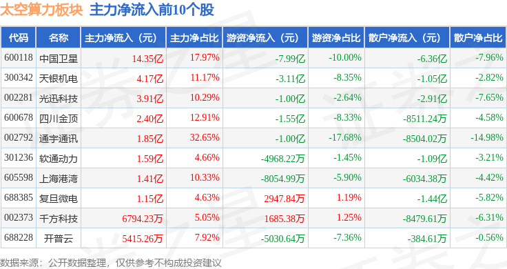 从资金流向上来看,当日太空算力板块主力资金净流出6.21亿元,游资资金净流出1.12亿元,散户资金净流入7.33亿元。太空算力板块个股资金流向见下表: