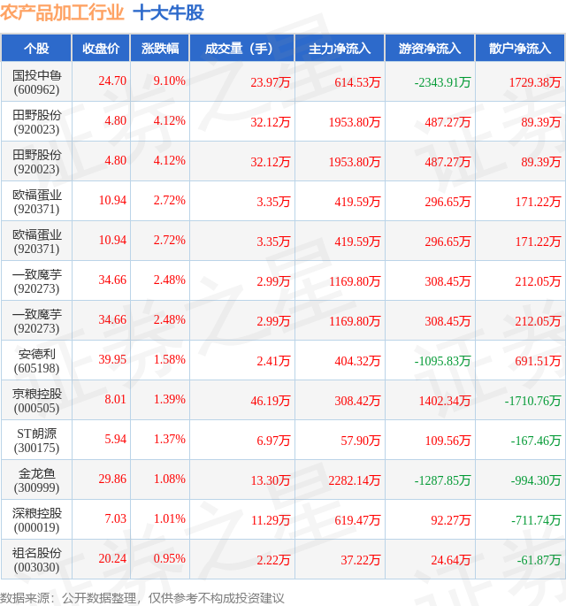 个股表现方面,农产品加工行业当日领涨股为国投中鲁(600962),该股当日报收24.7,上涨9.1%,成交量23.97万,主力资金净流入614.53万元。田野股份(920023)以上涨4.12%紧随其后,该股当日成交量32.12万,主力资金净流入1953.8万元。除此之外,田野股份(920023)、欧福蛋业(920371)、欧福蛋业(920371)均进入当日牛股之列。具体个股列表见下表: