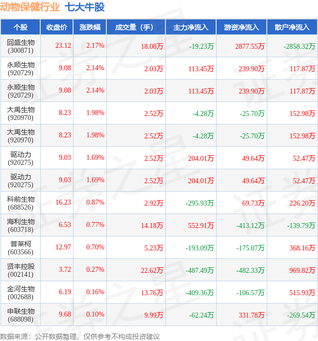 个股表现方面,动物保健行业当日领涨股为回盛生物(300871),该股当日报收23.12,上涨2.17%,成交量18.08万,主力资金净流出19.23万元。永顺生物(920729)以上涨2.14%紧随其后,该股当日成交量2.03万,主力资金净流入113.45万元。除此之外,永顺生物(920729)、大禹生物(920970)、大禹生物(920970)均进入当日牛股之列。具体个股列表见下表: