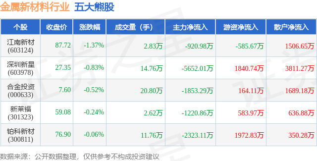 个股表现方面,金属新材料行业当日领跌股为江南新材(603124),该股当日报收87.72,下跌1.37%,成交量2.83万,主力资金净流出920.98万元。深圳新星(603978)以下跌0.83%紧随其后,该股当日成交量14.76万,主力资金净流出5652.01万元。除此之外,合金投资(000633)、新莱福(301323)、铂科新材(300811)均进入当日熊股之列。具体个股列表见下表: