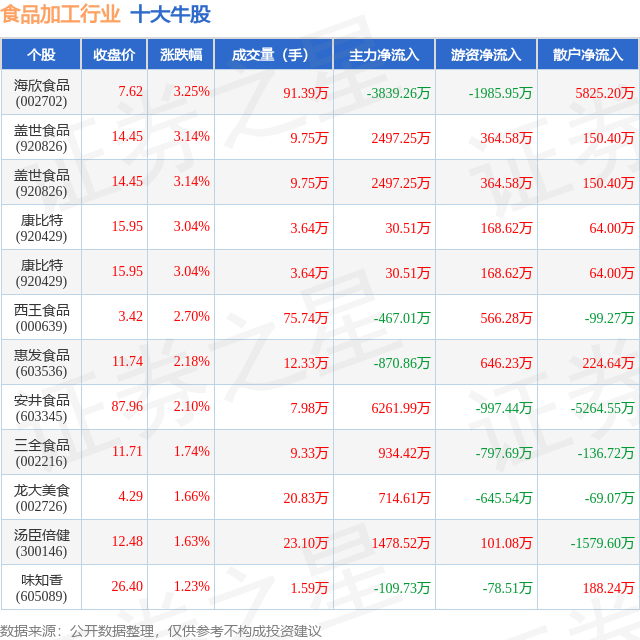 个股表现方面,食品加工行业当日领涨股为海欣食品(002702),该股当日报收7.62,上涨3.25%,成交量91.39万,主力资金净流出3839.26万元。盖世食品(920826)以上涨3.14%紧随其后,该股当日成交量9.75万,主力资金净流入2497.25万元。除此之外,盖世食品(920826)、康比特(920429)、康比特(920429)均进入当日牛股之列。具体个股列表见下表: