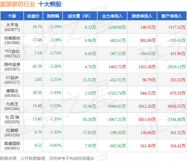 个股表现方面,服装家纺行业当日领跌股为太平鸟(603877),该股当日报收16.7,下跌3.19%,成交量8.32万,主力资金净流出1258.06万元。戎美股份(301088)以下跌3.18%紧随其后,该股当日成交量6.96万,主力资金净流出482.61万元。除此之外,*ST金比(002762)、扬州金泉(603307)、ST起步(603557)均进入当日熊股之列。具体个股列表见下表:
