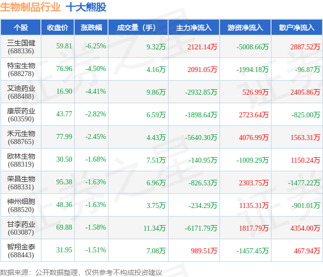 个股表现方面,生物制品行业当日领跌股为三生国健(688336),该股当日报收59.81,下跌6.25%,成交量9.32万,主力资金净流入2121.14万元。特宝生物(688278)以下跌4.5%紧随其后,该股当日成交量4.16万,主力资金净流入2091.05万元。除此之外,艾迪药业(688488)、康辰药业(603590)、禾元生物(688765)均进入当日熊股之列。具体个股列表见下表: