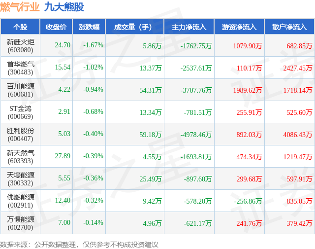个股表现方面,燃气行业当日领跌股为新疆火炬(603080),该股当日报收24.7,下跌1.67%,成交量5.86万,主力资金净流出1762.75万元。首华燃气(300483)以下跌1.02%紧随其后,该股当日成交量13.37万,主力资金净流出2537.61万元。除此之外,百川能源(600681)、ST金鸿(000669)、胜利股份(000407)均进入当日熊股之列。具体个股列表见下表: