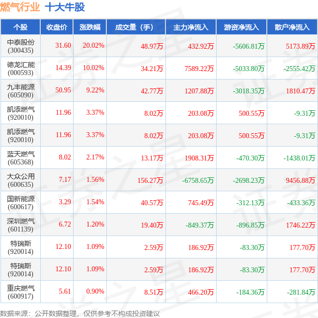 个股表现方面,燃气行业当日领涨股为中泰股份(300435),该股当日报收31.6,上涨20.02%,成交量48.97万,主力资金净流入432.92万元。德龙汇能(000593)以上涨10.02%紧随其后,该股当日成交量34.21万,主力资金净流入7589.22万元。除此之外,九丰能源(605090)、凯添燃气(920010)、凯添燃气(920010)均进入当日牛股之列。具体个股列表见下表:
