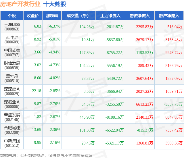 个股表现方面,房地产开发行业当日领跌股为三湘印象(000863),该股当日报收6.03,下跌6.37%,成交量104.26万,主力资金净流出2811.87万元。ST中迪(000609)以下跌5.01%紧随其后,该股当日成交量19.31万,主力资金净流出5837.6万元。除此之外,中国武夷(000797)、财信发展(000838)、黑牡丹(600510)均进入当日熊股之列。具体个股列表见下表: