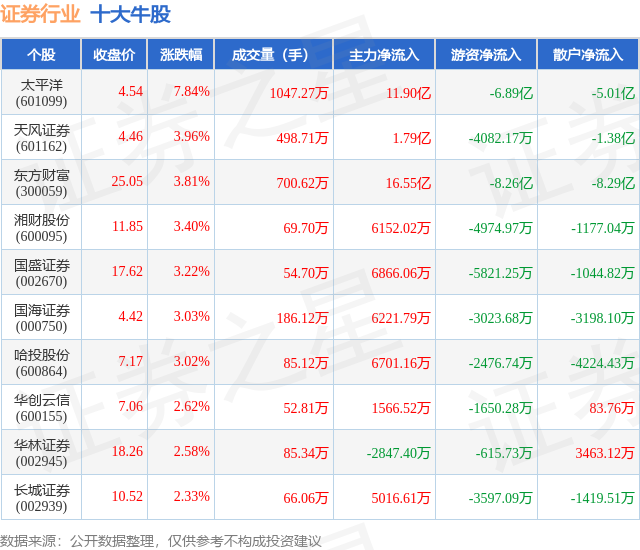 个股表现方面,证券行业当日领涨股为太平洋(601099),该股当日报收4.54,上涨7.84%,成交量1047.27万,主力资金净流入11.9亿元。天风证券(601162)以上涨3.96%紧随其后,该股当日成交量498.71万,主力资金净流入1.79亿元。除此之外,东方财富(300059)、湘财股份(600095)、国盛证券(002670)均进入当日牛股之列。具体个股列表见下表: