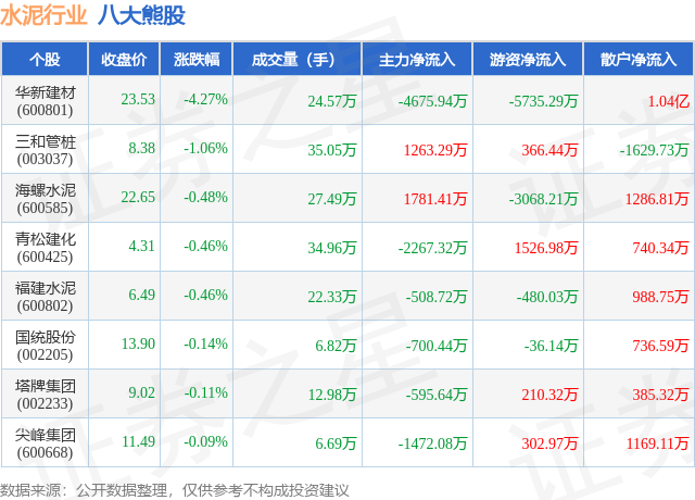 个股表现方面,水泥行业当日领跌股为华新建材(600801),该股当日报收23.53,下跌4.27%,成交量24.57万,主力资金净流出4675.94万元。三和管桩(003037)以下跌1.06%紧随其后,该股当日成交量35.05万,主力资金净流入1263.29万元。除此之外,海螺水泥(600585)、青松建化(600425)、福建水泥(600802)均进入当日熊股之列。具体个股列表见下表:
