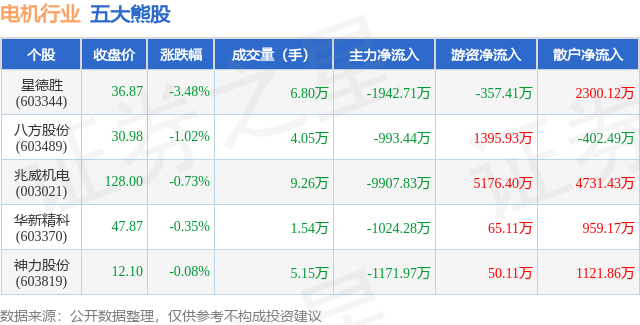 个股表现方面,电机行业当日领跌股为星德胜(603344),该股当日报收36.87,下跌3.48%,成交量6.8万,主力资金净流出1942.71万元。八方股份(603489)以下跌1.02%紧随其后,该股当日成交量4.05万,主力资金净流出993.44万元。除此之外,兆威机电(003021)、华新精科(603370)、神力股份(603819)均进入当日熊股之列。具体个股列表见下表: