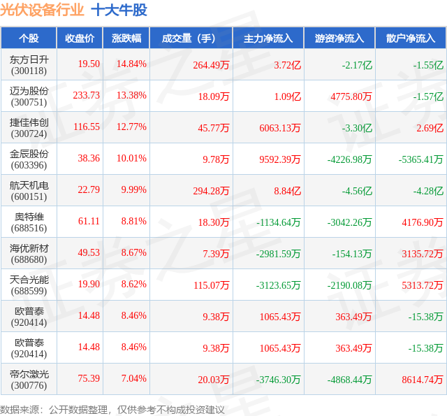 个股表现方面,光伏设备行业当日领涨股为东方日升(300118),该股当日报收19.5,上涨14.84%,成交量264.49万,主力资金净流入3.72亿元。迈为股份(300751)以上涨13.38%紧随其后,该股当日成交量18.09万,主力资金净流入1.09亿元。除此之外,捷佳伟创(300724)、金辰股份(603396)、航天机电(600151)均进入当日牛股之列。具体个股列表见下表: