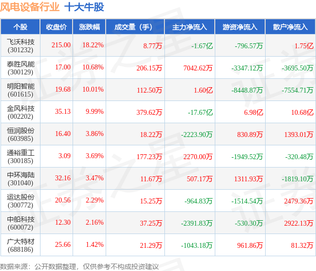 个股表现方面,风电设备行业当日领涨股为飞沃科技(301232),该股当日报收215.0,上涨18.22%,成交量8.77万,主力资金净流出1.67亿元。泰胜风能(300129)以上涨10.68%紧随其后,该股当日成交量206.15万,主力资金净流入7042.62万元。除此之外,明阳智能(601615)、金风科技(002202)、恒润股份(603985)均进入当日牛股之列。具体个股列表见下表: