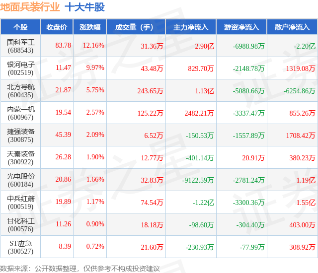 个股表现方面,地面兵装行业当日领涨股为国科军工(688543),该股当日报收83.78,上涨12.16%,成交量31.36万,主力资金净流入2.9亿元。银河电子(002519)以上涨9.97%紧随其后,该股当日成交量43.48万,主力资金净流入829.7万元。除此之外,北方导航(600435)、内蒙一机(600967)、捷强装备(300875)均进入当日牛股之列。具体个股列表见下表: