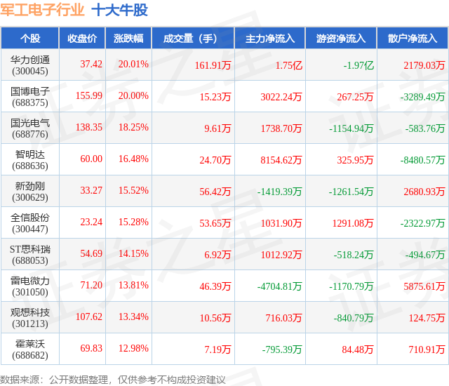 个股表现方面,军工电子行业当日领涨股为华力创通(300045),该股当日报收37.42,上涨20.01%,成交量161.91万,主力资金净流入1.75亿元。国博电子(688375)以上涨20.0%紧随其后,该股当日成交量15.23万,主力资金净流入3022.24万元。除此之外,国光电气(688776)、智明达(688636)、新劲刚(300629)均进入当日牛股之列。具体个股列表见下表: