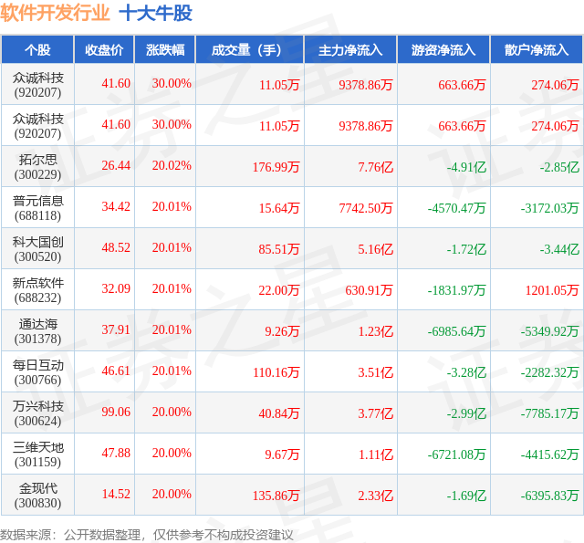 个股表现方面,软件开发行业当日领涨股为众诚科技(920207),该股当日报收41.6,上涨30.0%,成交量11.05万,主力资金净流入9378.86万元。众诚科技(920207)以上涨30.0%紧随其后,该股当日成交量11.05万,主力资金净流入9378.86万元。除此之外,拓尔思(300229)、普元信息(688118)、科大国创(300520)均进入当日牛股之列。具体个股列表见下表: