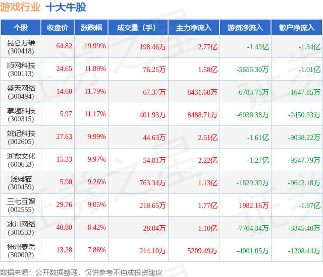 个股表现方面,游戏行业当日领涨股为昆仑万维(300418),该股当日报收64.82,上涨19.99%,成交量198.46万,主力资金净流入2.77亿元。顺网科技(300113)以上涨11.89%紧随其后,该股当日成交量76.25万,主力资金净流入1.58亿元。除此之外,盛天网络(300494)、掌趣科技(300315)、姚记科技(002605)均进入当日牛股之列。具体个股列表见下表: