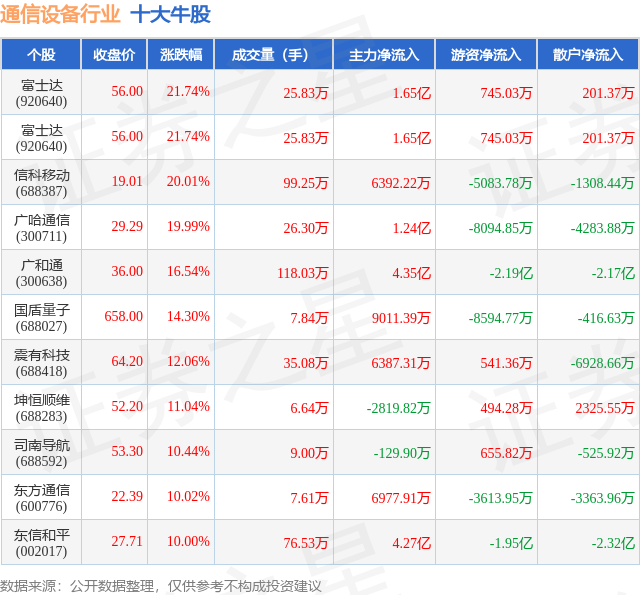 个股表现方面,通信设备行业当日领涨股为富士达(920640),该股当日报收56.0,上涨21.74%,成交量25.83万,主力资金净流入1.65亿元。富士达(920640)以上涨21.74%紧随其后,该股当日成交量25.83万,主力资金净流入1.65亿元。除此之外,信科移动(688387)、广哈通信(300711)、广和通(300638)均进入当日牛股之列。具体个股列表见下表: