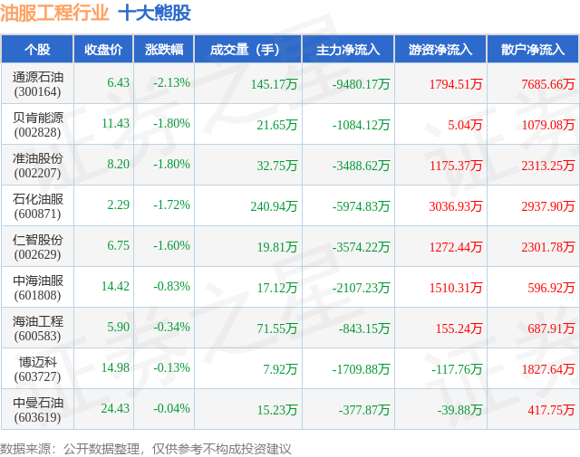 个股表现方面,油服工程行业当日领跌股为通源石油(300164),该股当日报收6.43,下跌2.13%,成交量145.17万,主力资金净流出9480.17万元。贝肯能源(002828)以下跌1.8%紧随其后,该股当日成交量21.65万,主力资金净流出1084.12万元。除此之外,准油股份(002207)、石化油服(600871)、仁智股份(002629)均进入当日熊股之列。具体个股列表见下表: