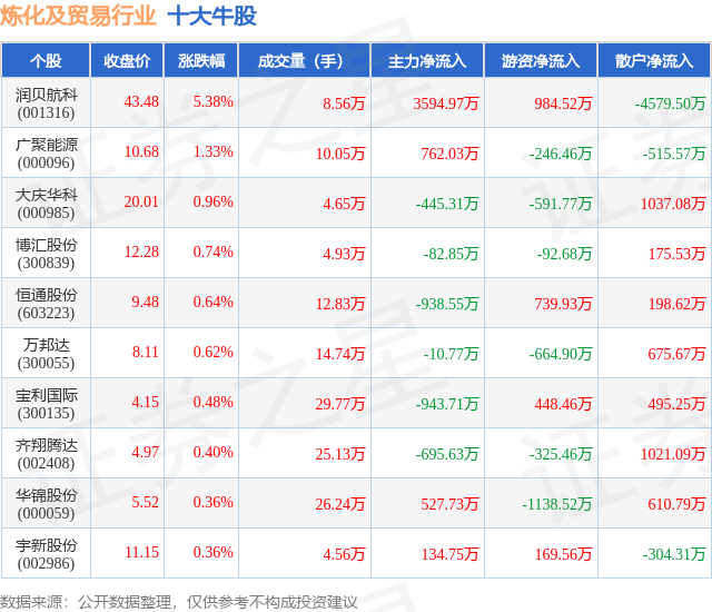 个股表现方面,炼化及贸易行业当日领涨股为润贝航科(001316),该股当日报收43.48,上涨5.38%,成交量8.56万,主力资金净流入3594.97万元。广聚能源(000096)以上涨1.33%紧随其后,该股当日成交量10.05万,主力资金净流入762.03万元。除此之外,大庆华科(000985)、博汇股份(300839)、恒通股份(603223)均进入当日牛股之列。具体个股列表见下表:
