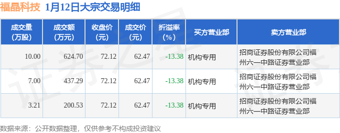 证券之星消息,1月12日福晶科技发生大宗交易,交易数据如下: