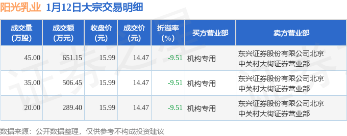 证券之星消息,1月12日阳光乳业发生大宗交易,交易数据如下: