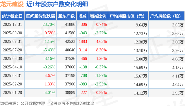 从股价来看,2025年9月30日至2025年12月31日,龙元建设区间跌幅为23.7%,在此期间股东户数增加306.0户,增幅为0.74%。