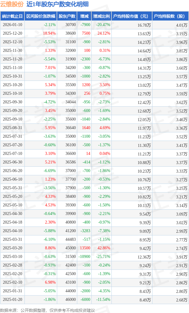 证券之星消息,近日云维股份披露,截至2026年1月10日公司股东户数为3.07万户,较12月20日减少7900.0户,减幅为20.47%。户均持股数量由上期的3.19万股增加至4.01万股,户均持股市值为16.78万元。