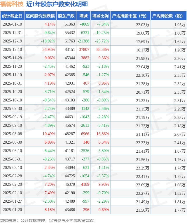 从股价来看,2025年12月31日至2026年1月10日,福蓉科技区间涨幅为4.14%,在此期间股东户数减少4069.0户,减幅为7.34%。