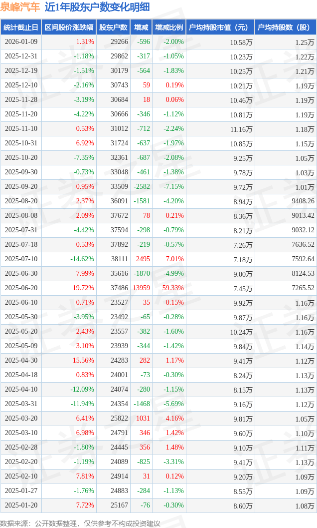 证券之星消息,近日泉峰汽车披露,截至2026年1月9日公司股东户数为2.93万户,较12月31日减少596.0户,减幅为2.0%。户均持股数量由上期的1.22万股增加至1.25万股,户均持股市值为10.58万元。