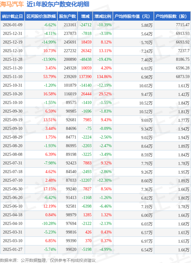 从股价来看,2025年12月31日至2026年1月9日,海马汽车区间跌幅为6.62%,在此期间股东户数减少2.47万户,减幅为10.39%。