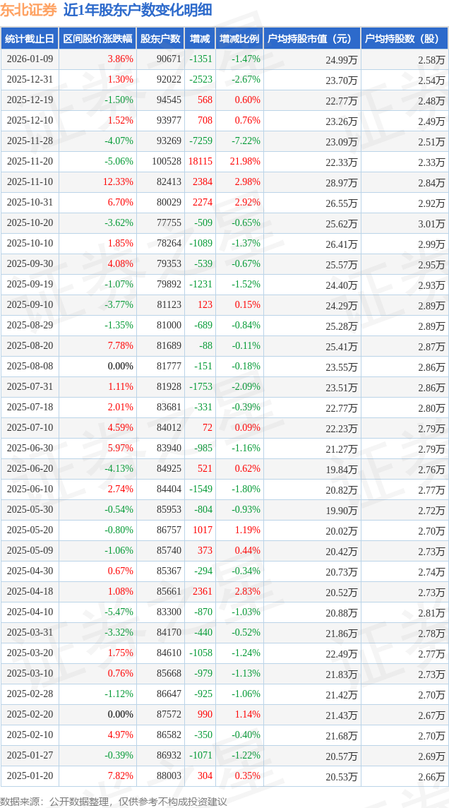 从股价来看,2025年12月31日至2026年1月9日,东北证券区间涨幅为3.86%,在此期间股东户数减少1351.0户,减幅为1.47%。