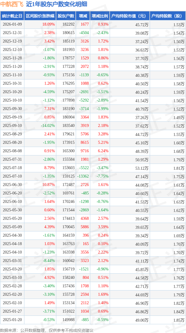 从股价来看,2025年12月31日至2026年1月9日,中航西飞区间涨幅为18.09%,在此期间股东户数增加1677.0户,增幅为0.93%。