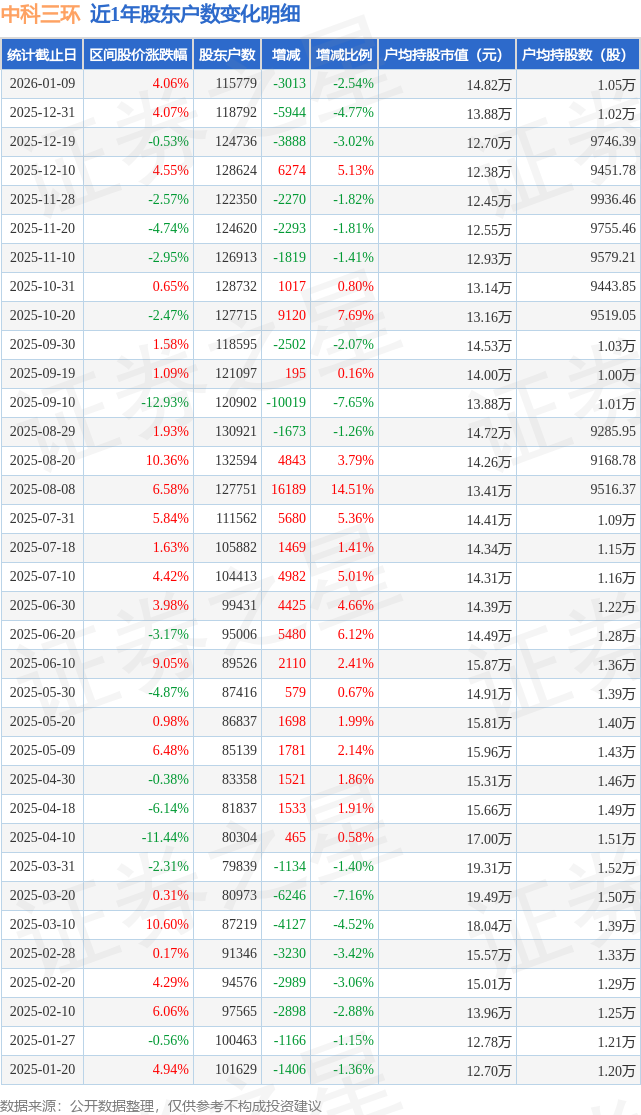 从股价来看,2025年12月31日至2026年1月9日,中科三环区间涨幅为4.06%,在此期间股东户数减少3013.0户,减幅为2.54%。