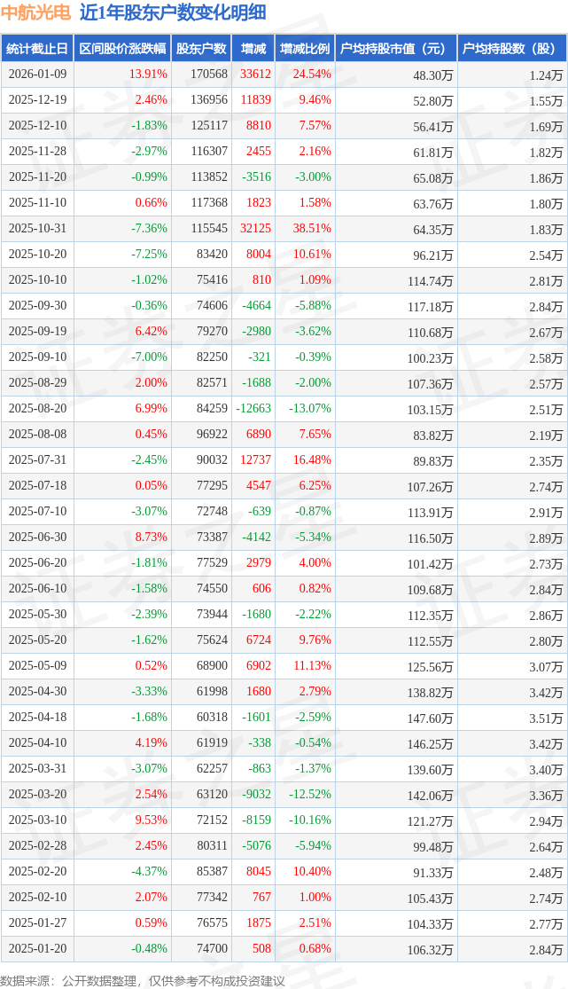 从股价来看,2025年12月19日至2026年1月9日,中航光电区间涨幅为13.91%,在此期间股东户数增加3.36万户,增幅为24.54%。