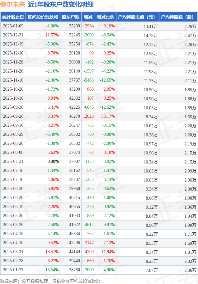 从股价来看,2025年12月31日至2026年1月9日,德尔未来区间跌幅为1.0%,在此期间股东户数增加2964.0户,增幅为9.19%。