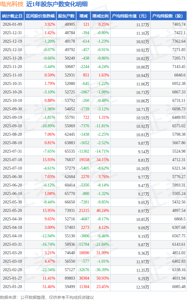 从股价来看,2025年12月31日至2026年1月9日,电光科技区间涨幅为3.92%,在此期间股东户数增加121.0户,增幅为0.25%。