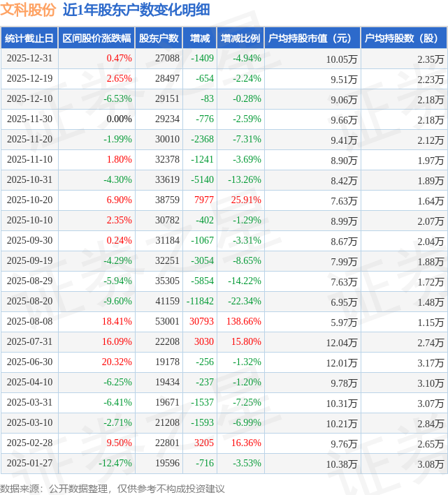 从股价来看,2025年12月19日至2025年12月31日,文科股份区间涨幅为0.47%,在此期间股东户数减少1409.0户,减幅为4.94%。
