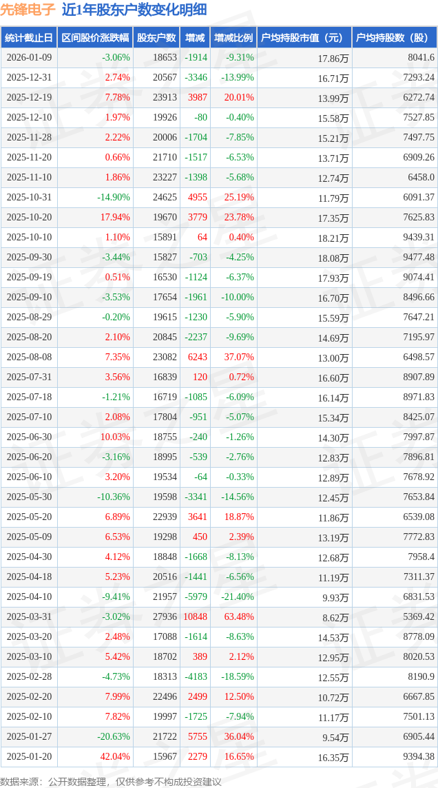 从股价来看,2025年12月31日至2026年1月9日,先锋电子区间跌幅为3.06%,在此期间股东户数减少1914.0户,减幅为9.31%。