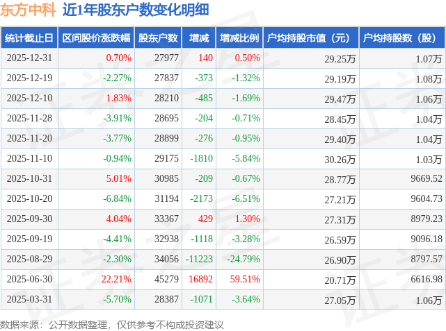 证券之星消息,近日东方中科披露,截至2025年12月31日公司股东户数为2.8万户,较12月19日增加140.0户,增幅为0.5%。户均持股数量由上期的1.08万股减少至1.07万股,户均持股市值为29.25万元。