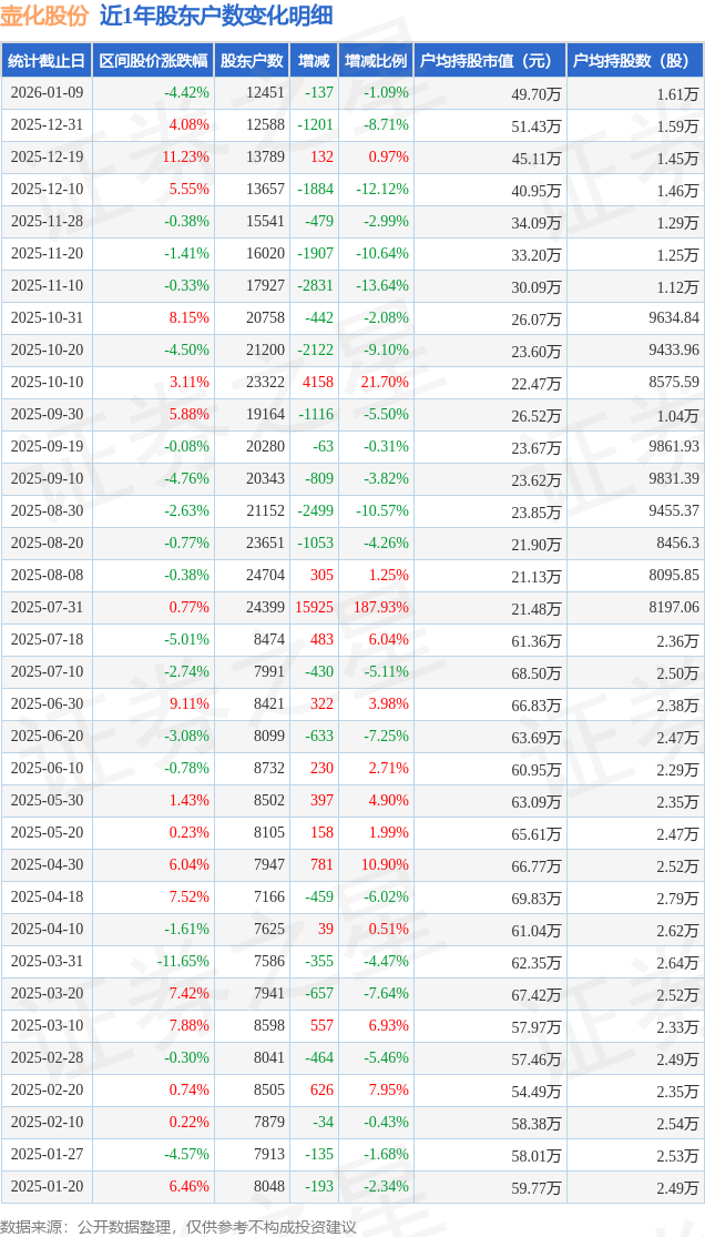 从股价来看,2025年12月31日至2026年1月9日,壶化股份区间跌幅为4.42%,在此期间股东户数减少137.0户,减幅为1.09%。