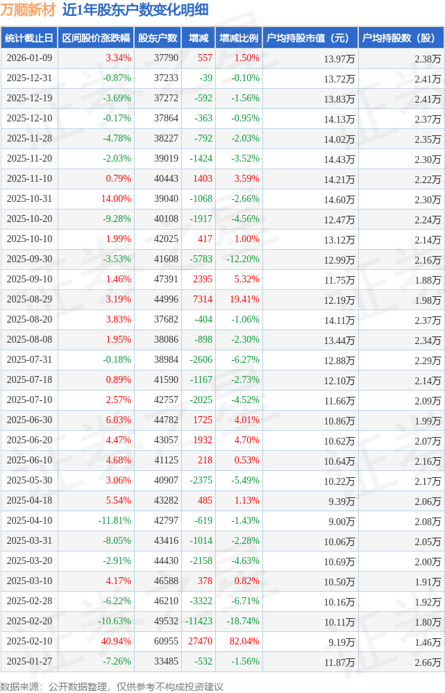 从股价来看,2025年12月31日至2026年1月9日,万顺新材区间涨幅为3.34%,在此期间股东户数增加557.0户,增幅为1.5%。