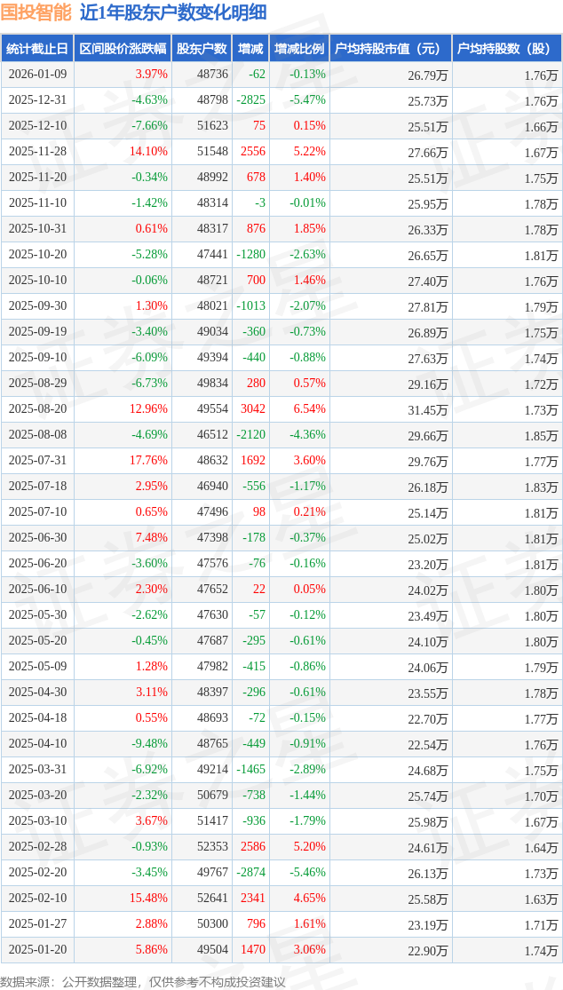 从股价来看,2025年12月31日至2026年1月9日,国投智能区间涨幅为3.97%,在此期间股东户数减少62.0户,减幅为0.13%。