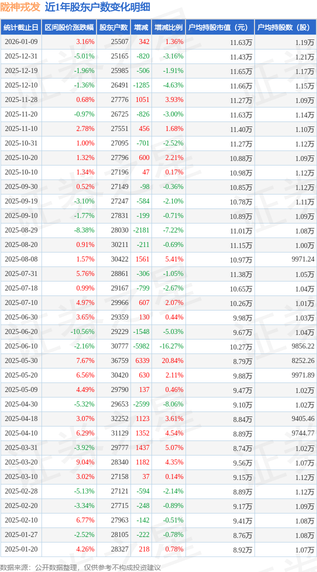 证券之星消息,近日陇神戎发披露,截至2026年1月9日公司股东户数为2.55万户,较12月31日增加342.0户,增幅为1.36%。户均持股数量由上期的1.21万股减少至1.19万股,户均持股市值为11.63万元。